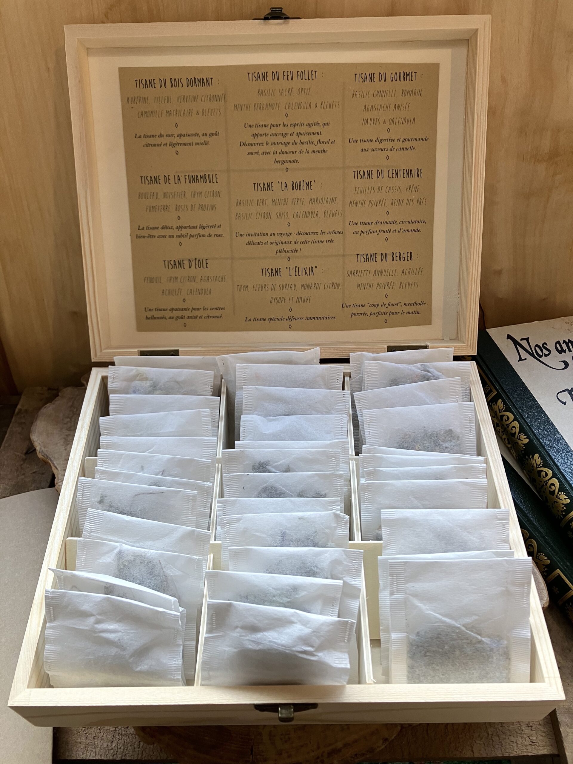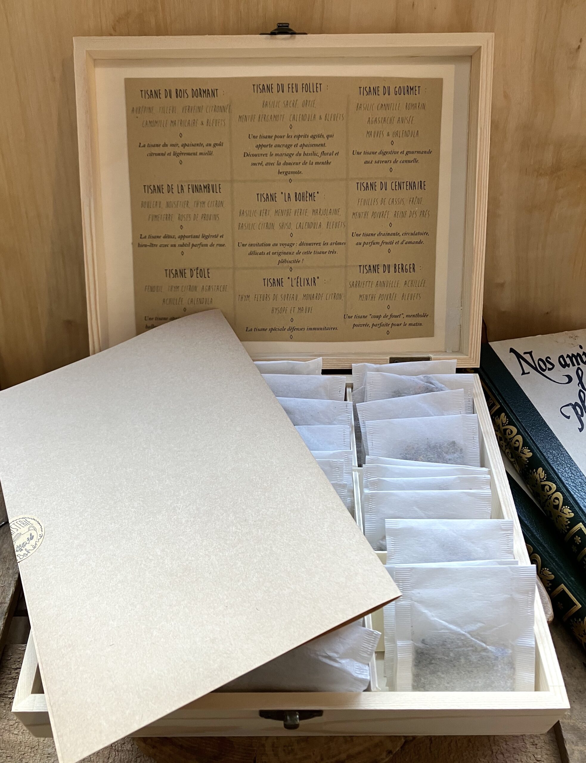 Le tout sera présenté dans un coffret en bois de peuplier, vitré, avec sa fiche explicative sur les tisanes, leur composition, et comment les faire infuser.
